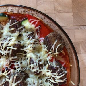 However, when I realized that there wasn’t enough stuff in my fridge for a standard oven session I decided to throw together all the rests in a casserole and to add some canned Italian tomatoes as well as some meatballs. The mix went into the oven and … a delicious dinner dish was ready rather soon.